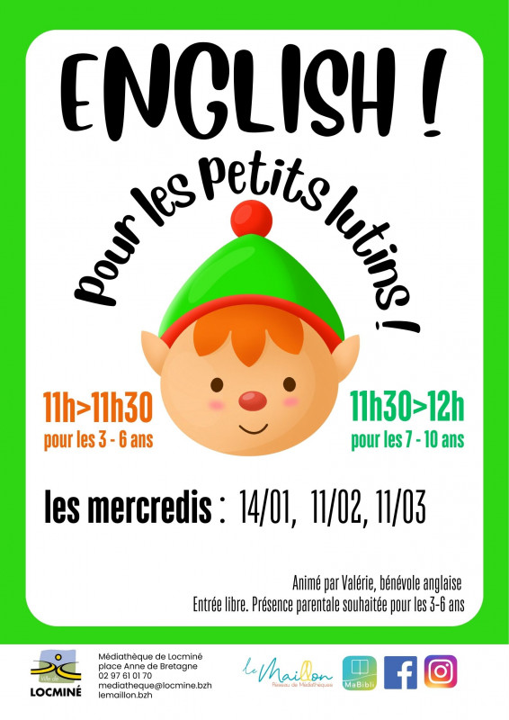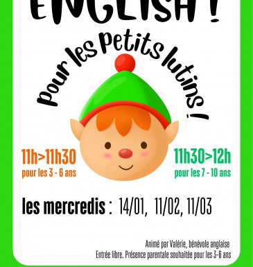 Les enfants se familiarisent avec l'anglais par des comptines dansées pour les plus jeunes. Pour les 3 à 6 ans de 11h à 11h30. Les enfants se familiarisent avec l'anglais par des jeux. Pour les 7 à 10 ans de 11h30 à 12h. Animé par Valérie Davenport, bénévole anglaise. Entrée libre pour les 2 séances.