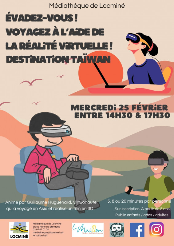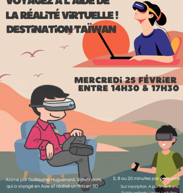 Animé par Guillaume Huguenard, Virtuonaute qui a voyagé en Asie, réalisateur de films en 3D. Guillaume va vous faire partager son voyage à Taïwan à travers des films projetés grâce à ses casques de réalité virtuelle. Sur inscription. A partir de 8 ans. 5, 8 ou 20 min. par personne. Public enfants / ados / adultes
