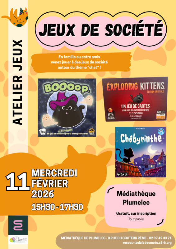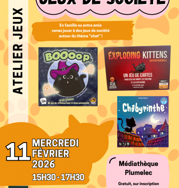 À l’occasion du mois du chat, la médiathèque de Plumelec vous invite à partager un moment ludique autour de jeux de société sur le thème des chats.